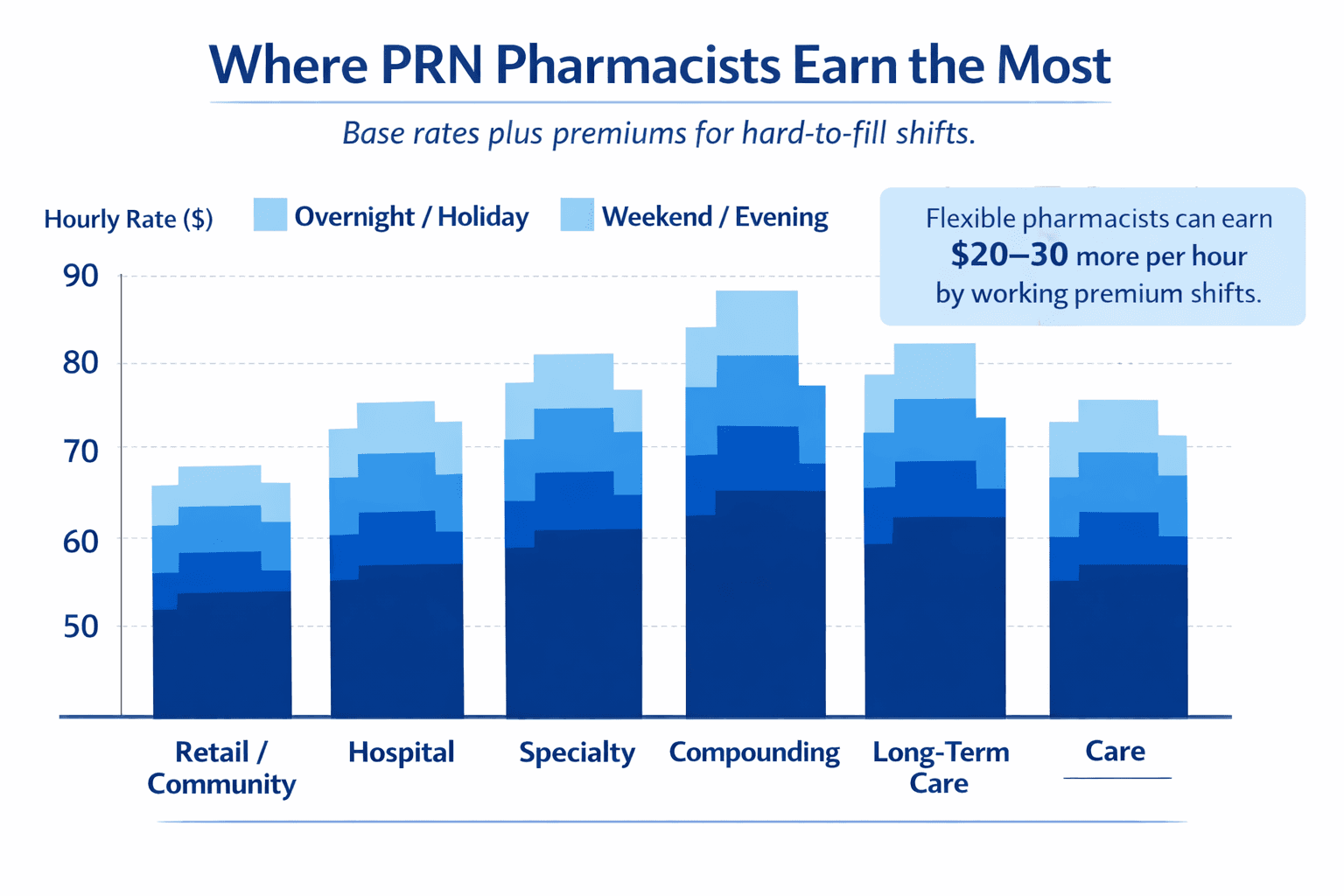 A pharmacist earning $60/hour on weekday daytime shifts might earn $75-$85/hour for a last-minute Saturday overnight—a significant boost for flexibility.