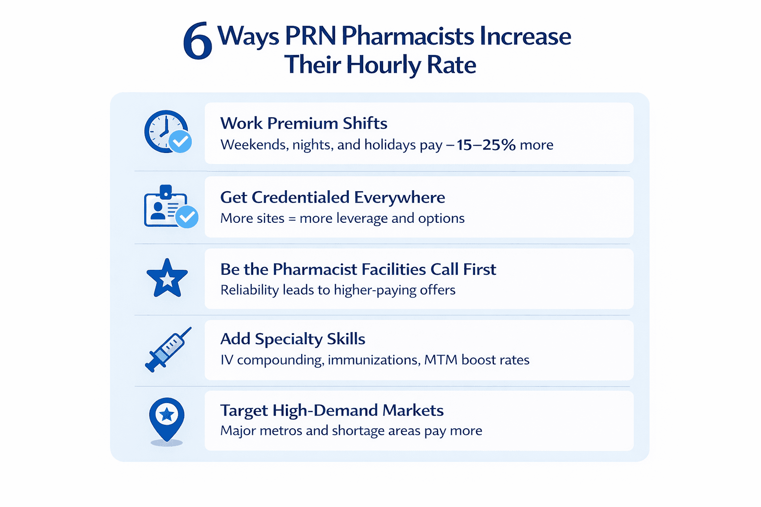Facilities pay premium rates for pharmacists they trust. Show up on time, document thoroughly, and handle unexpected situations professionally. Word spreads quickly.